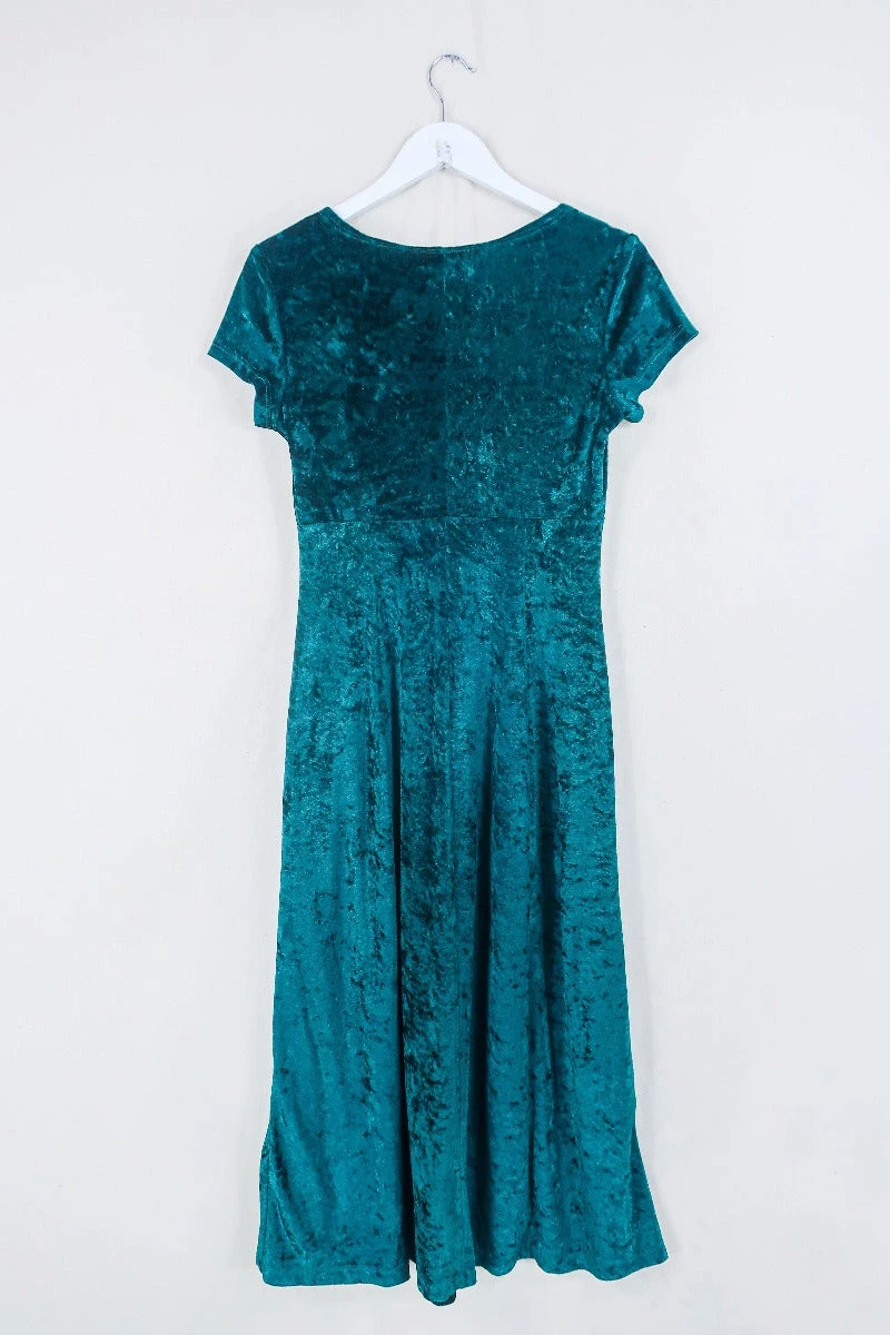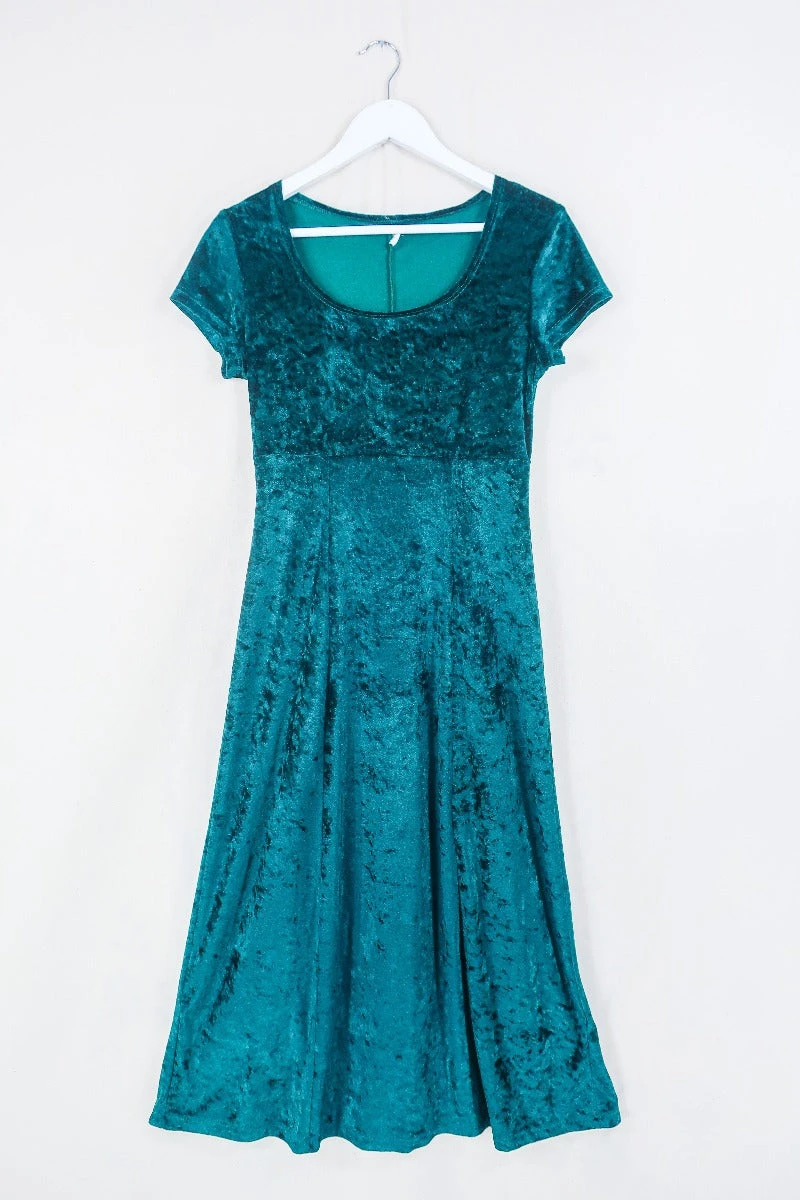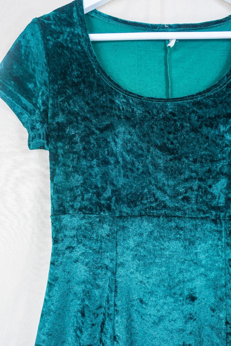 A simple but stunning vintage midi dress in a gorgeous & luxurious crushed velvet fabric. This deep green dress is perfect for dressing up – pair her with chains, chunky boots and a leather jacket for an easy punky Y2K look.