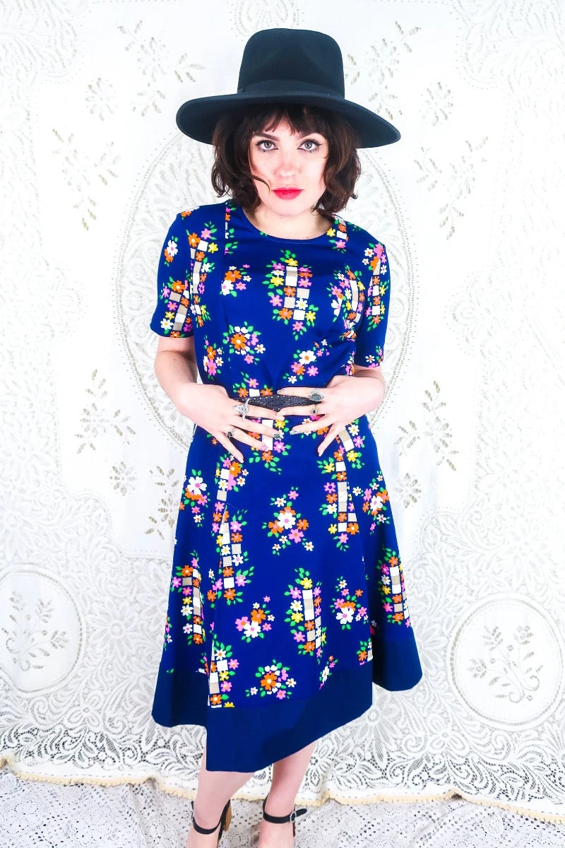 Classic & easy to wear, this short sleeve vintage 70s dress is an easy and essential fit. In a gorgeous, deep indigo colour with a unique print, a contrast hem & pleated skirt this i a dreamy vintage midi dress.