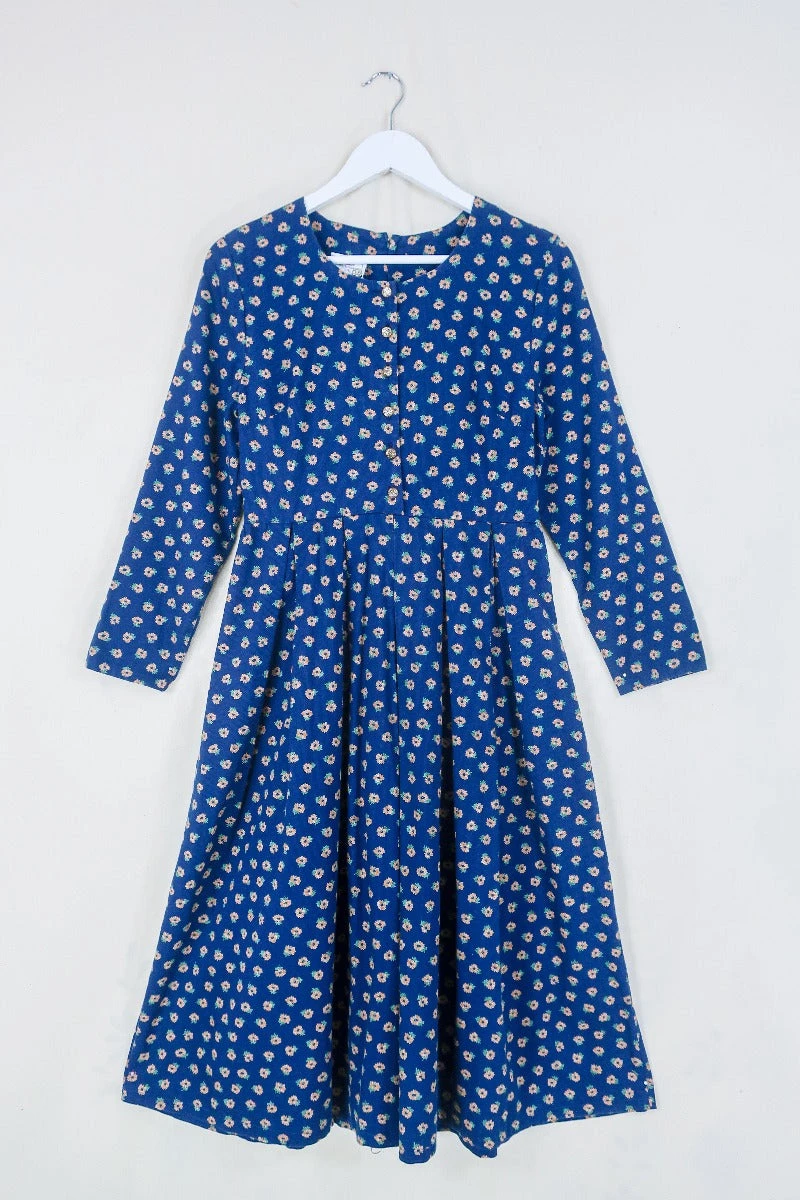 This vintage midi dress is the perfect winter staple, with a mock needle cord fabric, and sweet ditsy floral design, pair this beauty with any chunky knit to fulfil your vintage cottage core vibes!Â