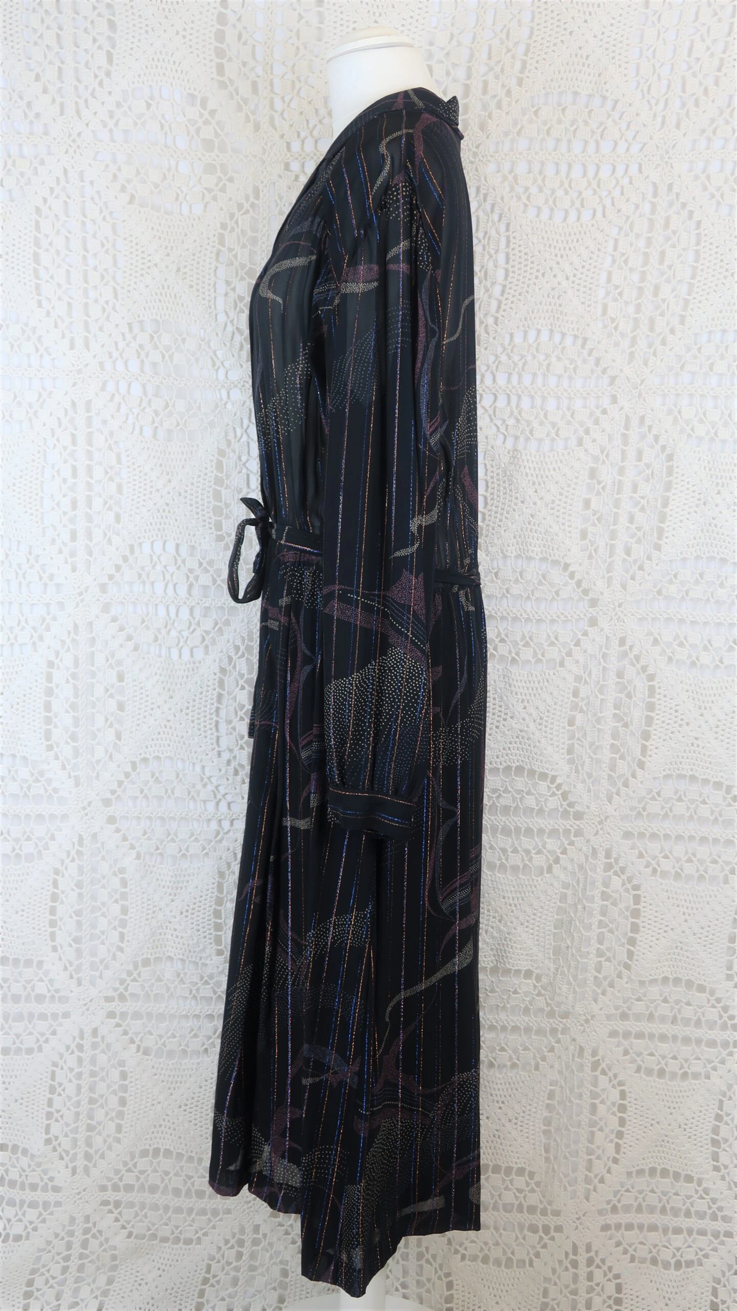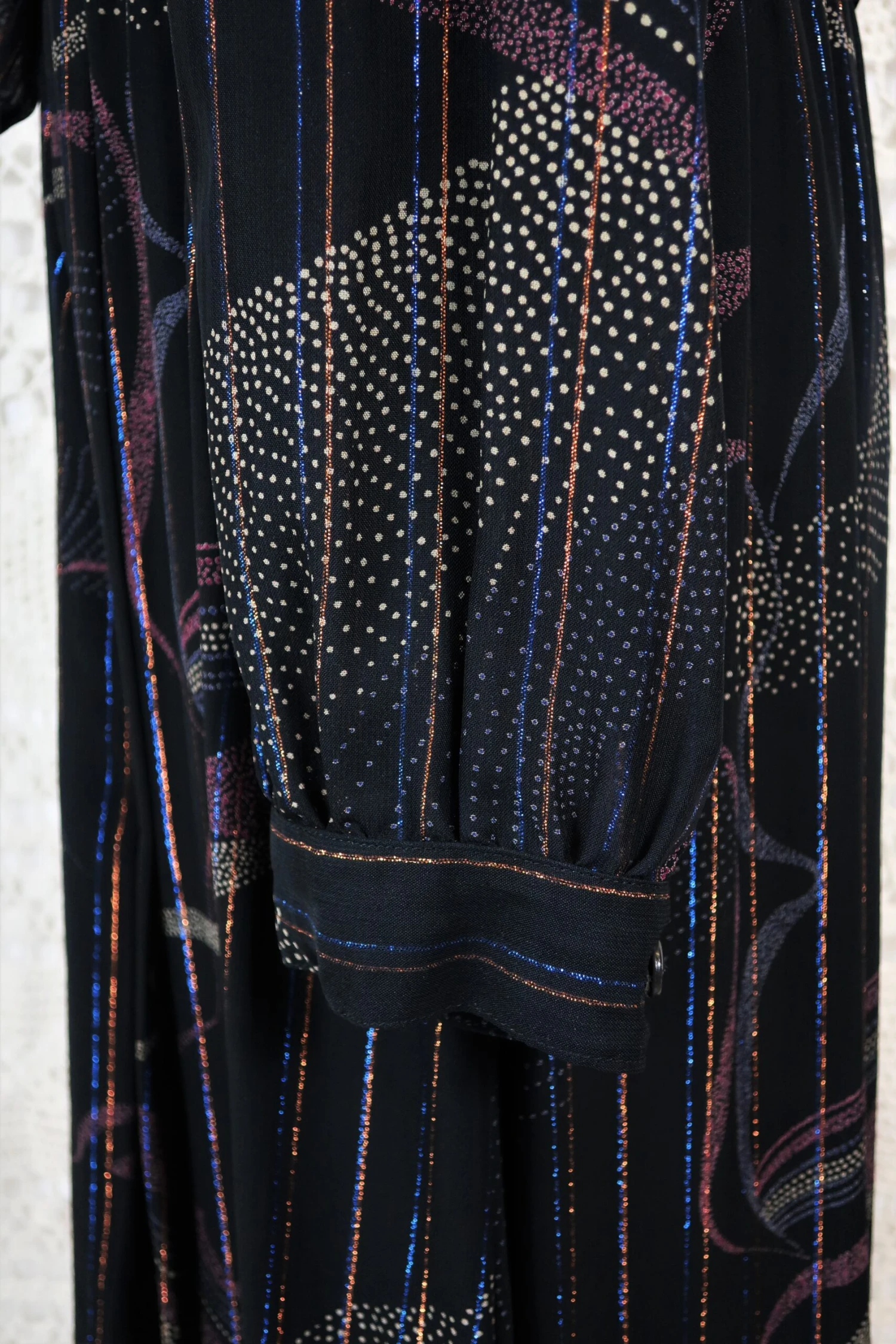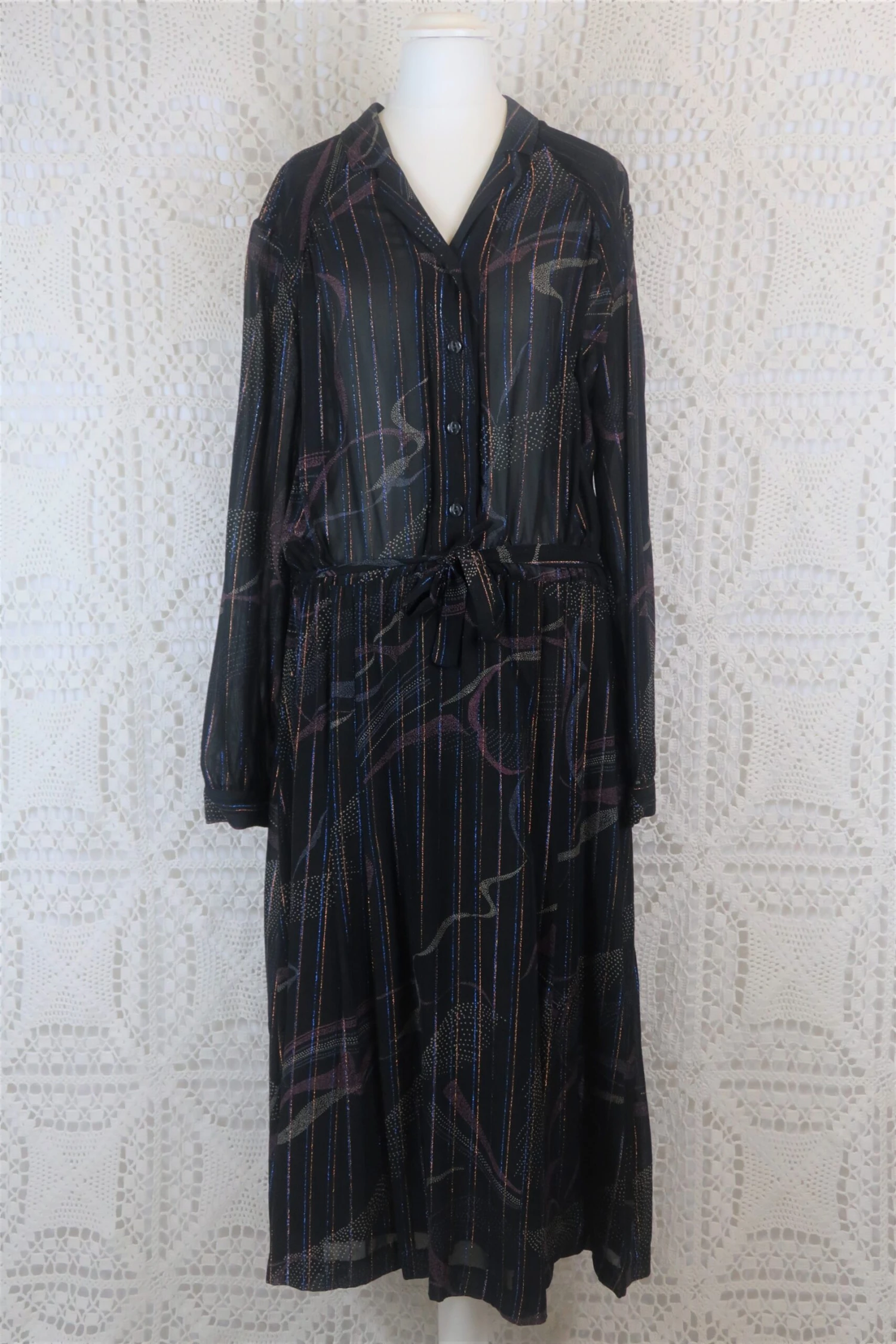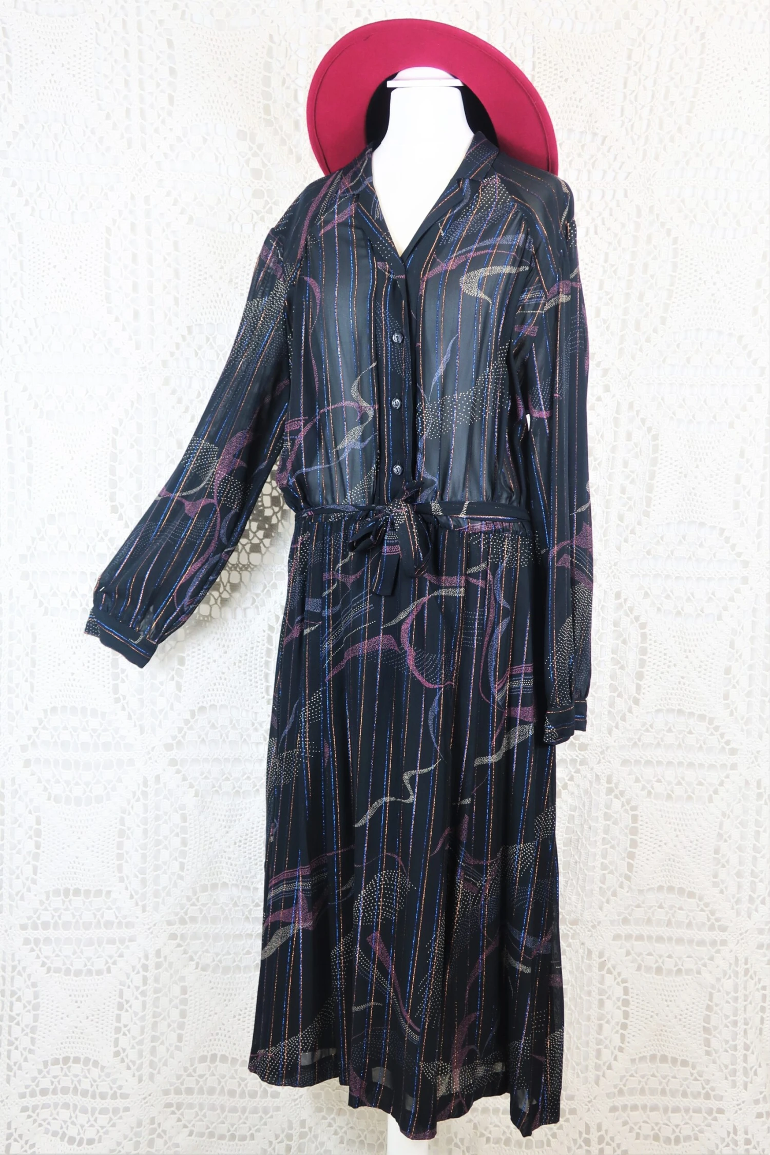 The sheer black, combined with the muted pattern and metallic thread, gives this dress the movement and intrigue of a distant nebula