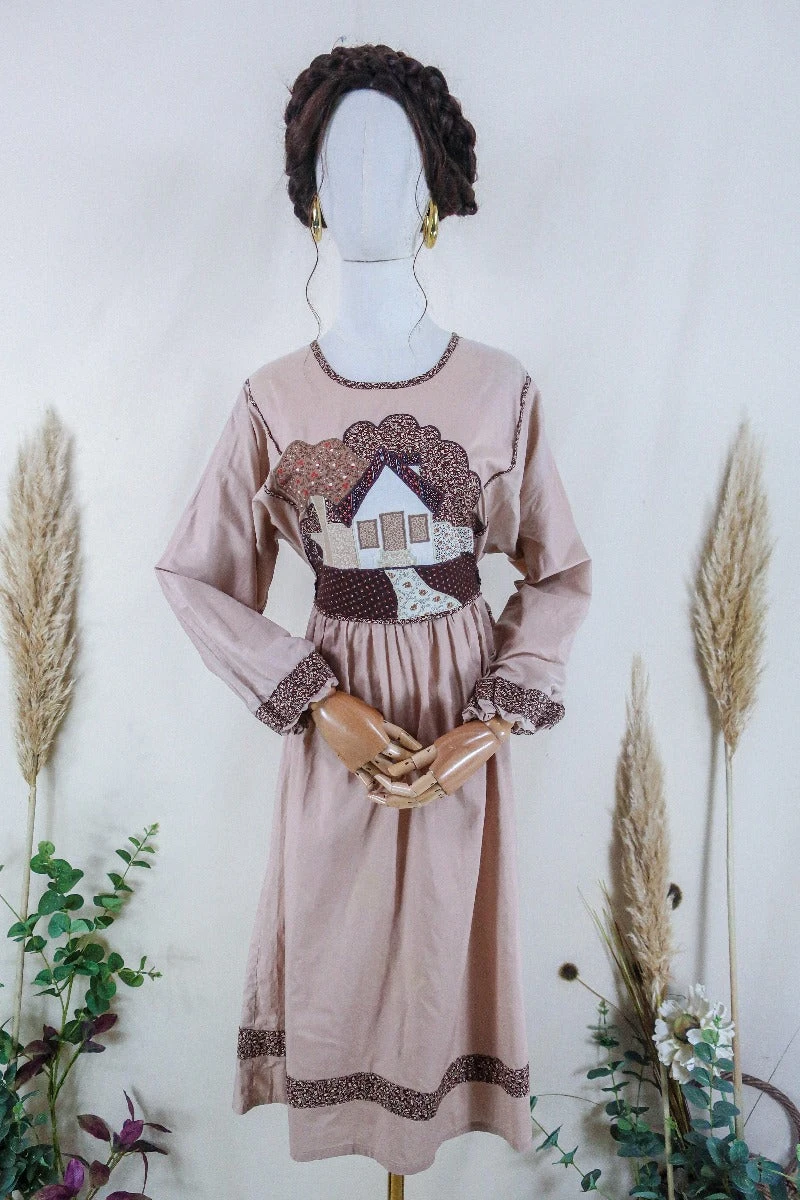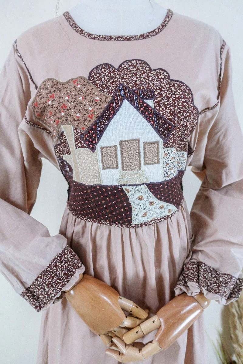Super cute & unique, this adorable vintage midi dress has an amazing quilted cottage applique design that’s just to die for! With a warm brown floral trim in a print reminiscent of vintage Laura Ashley, this is the perfect vintage piece to add to your spring & summer wardrobe.