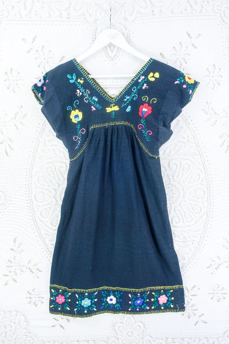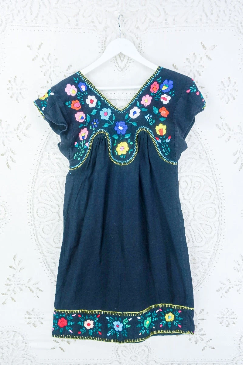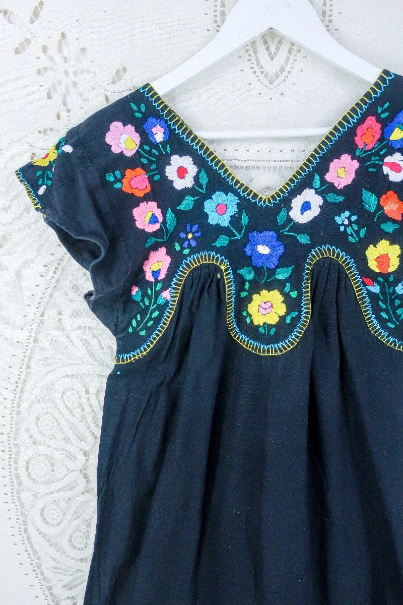 Gorgeous Mexican folk sun dress in a dark black base tone with contrasting vibrant traditional floral embroidery. Looks to be handmade and lovely quality. Would look stunning paired with lots of gold jewellery!