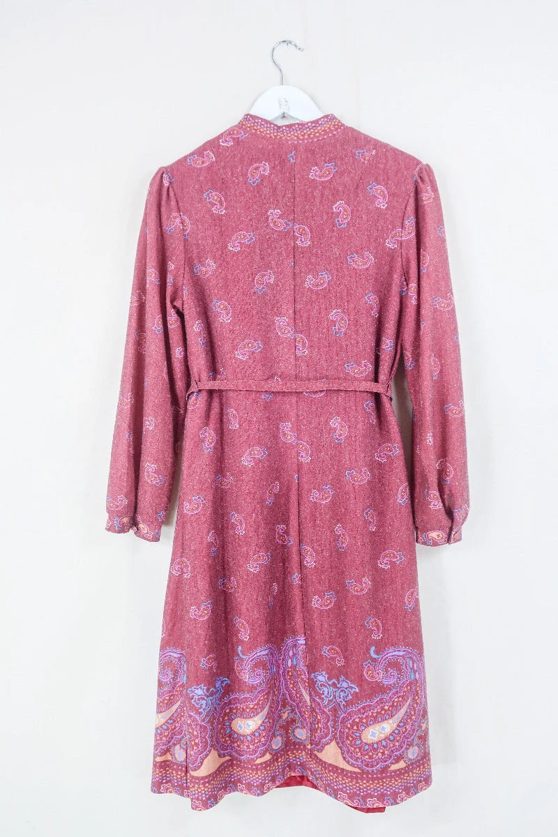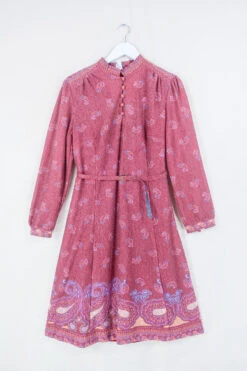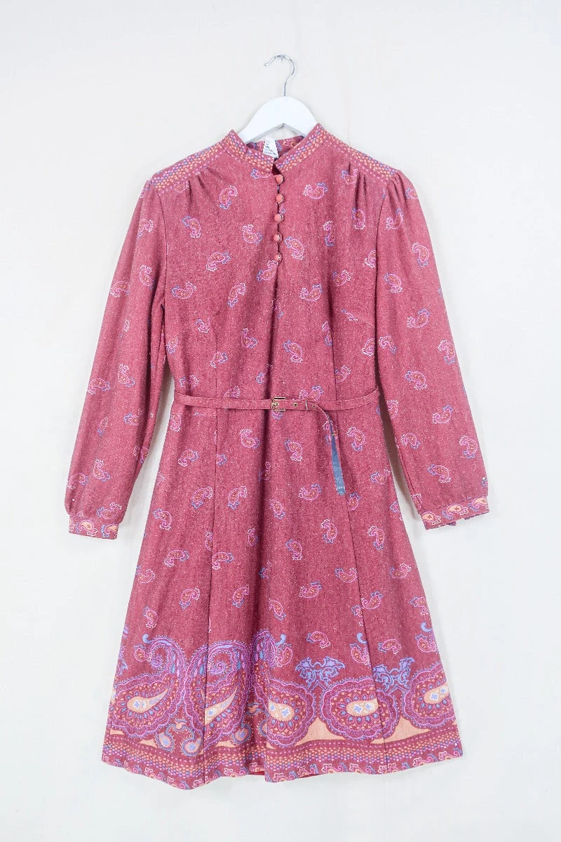 This super cute vintage mini dress features long cuffed pompom sleeves and a button up v neckline. Combine this with its matching, vegan leather backed belt and you’ve got an easy & eye catching outfit.