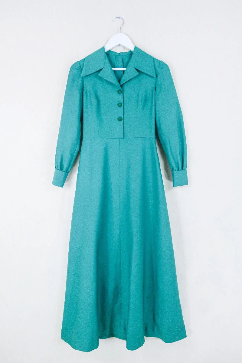 With a nautical, notched pointed collar and button up bishop sleeves. This dark sage green vintage dress strikes a classic silhouette in a style that can adapt to fit the season.