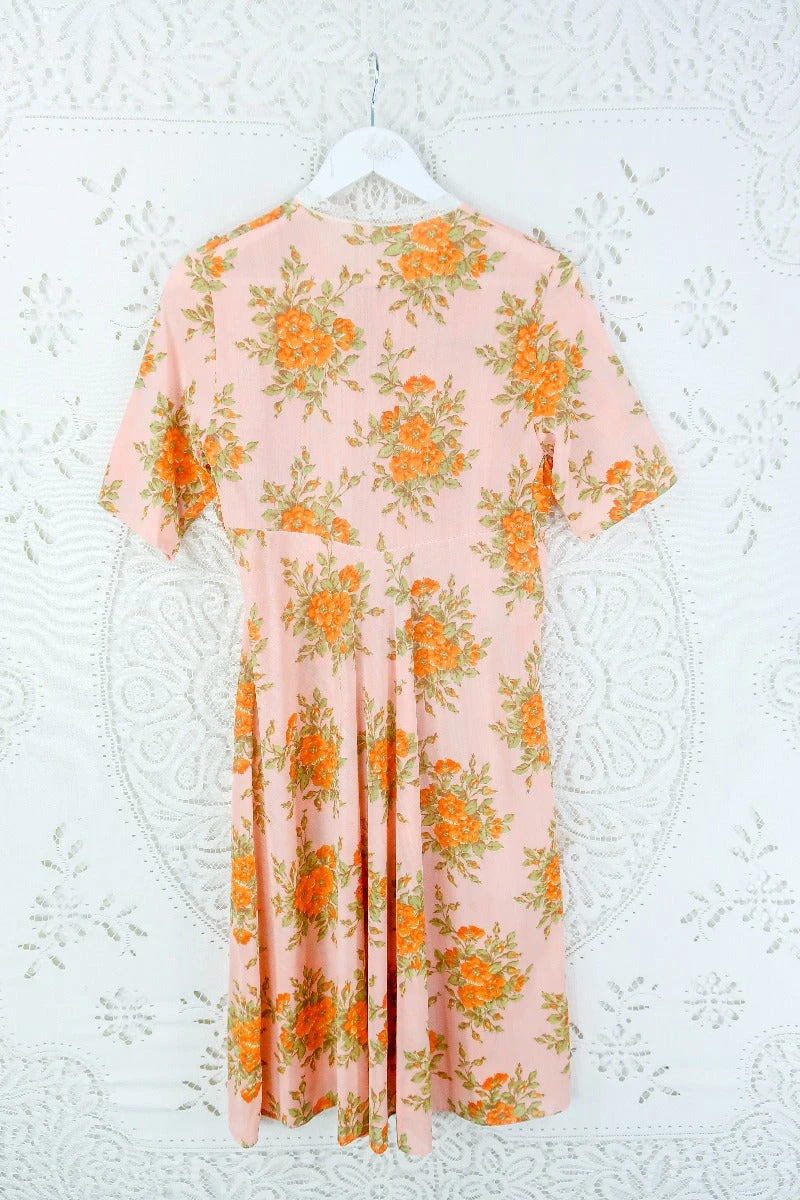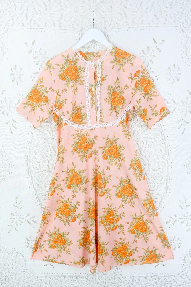 The sweetest petal pink lacey nightdress/slip with a retro sage and tangerine floral print. Featuring a button up chest and a feminine empire line, it gives a super flattering shape. There’s no reason it’s not perfect for daywear too!Â