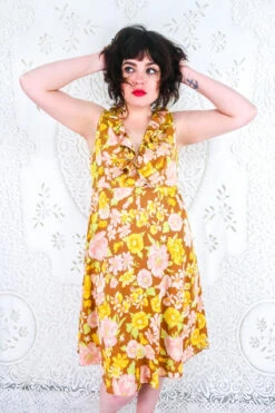 Cute retro midi slip dress with a 70’s style earth tone print. Featuring a crossover style ruffle V-neckline and a retro sunny floral print of pinks, greens and yellows. Can be worn as nightwear or daywear in Summer as it is sleeveless – would make the prettiest party dress!