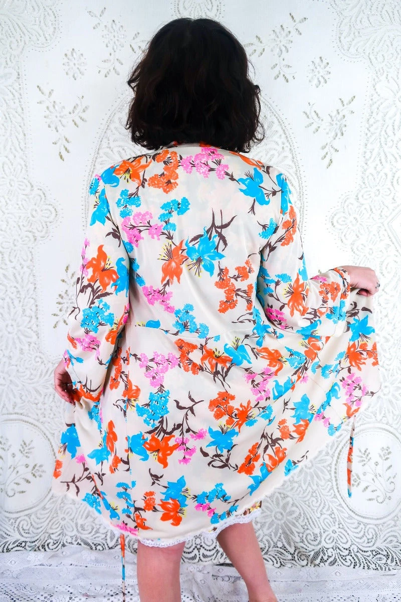 A chic, fun bold floral wrap dress with a bright retro floral pattern – reminiscent of those sunny warm days! Wear as a dress or kimono for daywear, alternatively wear as loungewear all year round.