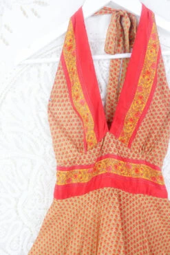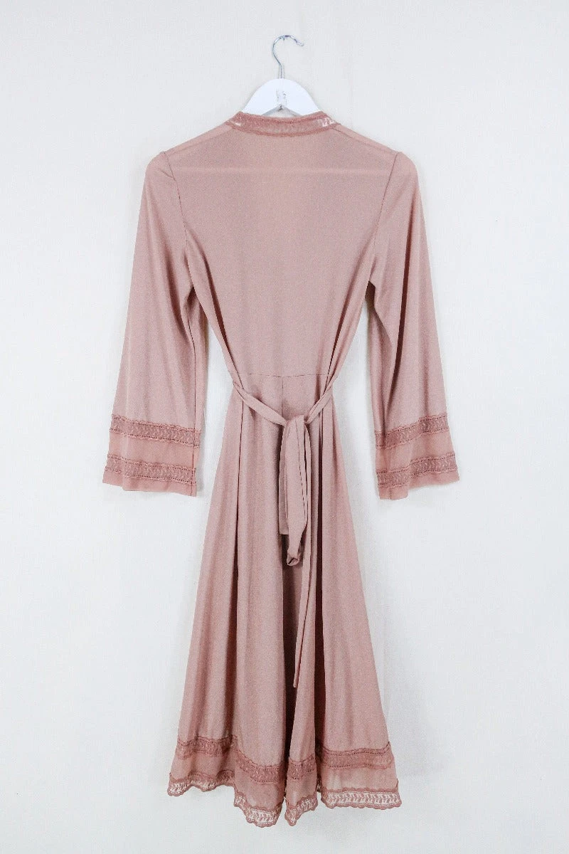 Beautiful classic earth rose toned wrap dress / dressing gown with retro glam vintage lace detailing. Wear over a slip with gold jewellery for an evening dress or wear as a light layer for lounging at home.Â