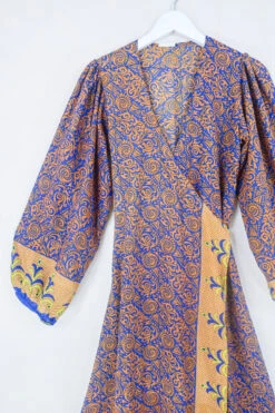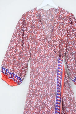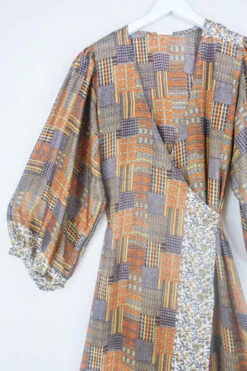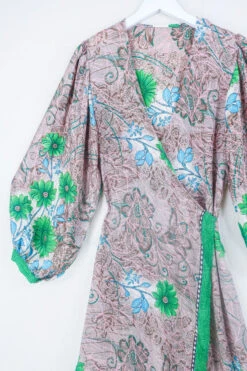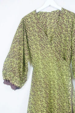 Lola Long Wrap Dress – Chocolate Brown & Pistachio Botanical – Vintage Indian Sari – Size XXL
